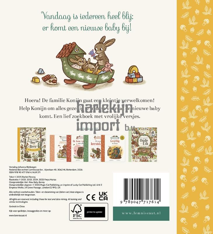 Vandaag is iedereen heel blij:er komt een nieuwe baby bij!Hoera! de familie Konijn gaat een kleintje verwelkomen! Help Konijn om alles gezellig te maken in het bos voordat de nieuwe baby komt. Vind honderd dingen in dit lieve, kartonnen zoekboek met vrolijke versjes uit de wereld van het Bijzondere Bos van Beer.
