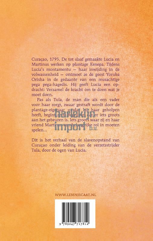 <p>Curaçao, 1795. Tijdens Lucia’s <em>montamentu </em>– haar inwijding in de volwassenheid – ontmoet ze de geest Yoruba Orisha in de gedaante van een reusachtige pega pega-hagedis. Pas als Tula, de man die als een vader voor haar zorgt, zwaar gestraft wordt omdat hij haar geholpen heeft, begint ze te begrijpen dat er iets groots aan het gebeuren is. Iets groots waar zij en haar vriend Martinus een belangrijke rol in moeten spelen.</p><p>Robin Raven beschrijft het verhaal van de slavenopstand onder leiding van de verzetsstrijder Tula op onnavolgbare wijze. Dit boek maakt het leed, de woede, de onverzettelijkheid en de moed van Lucia, Martinus, Tula en de andere tot slaaf gemaakten zo invoelbaar dat iedereen dit zou moeten lezen.</p>