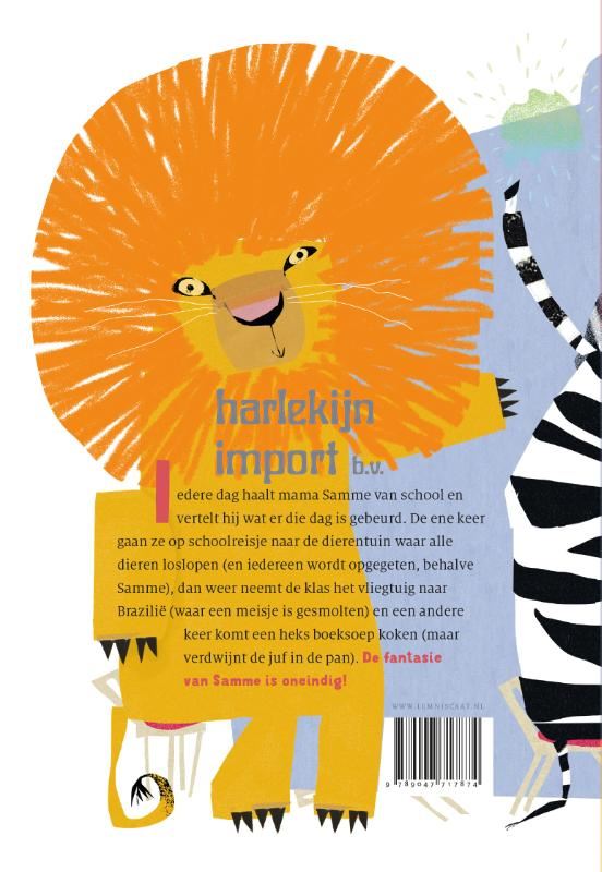 <p>Iedere dag haalt mama Samme van school en vertelt hij wat er die dag is gebeurd. Het schoolleven van een kleuter is bepaald niet saai, als je Samme mag geloven. De ene keer gaan ze op schoolreisje naar de dierentuin waar alle dieren loslopen (en iedereen wordt opgegeten, behalve Samme), dan weer neemt de klas het vliegtuig naar Brazilie (waar een meisje is gesmolten) en een andere keer komt een heks boeksoep koken (maar verdwijnt de juf in de pan).</p><p>En het is onduidelijk wie de grootste fantasie heeft: Samme, Anke Kranendonk die zijn verhalen verzon, of Barbara de Wolf die ze illustreerde. Een verrukkelijk vrolijk voorleesboek!</p>