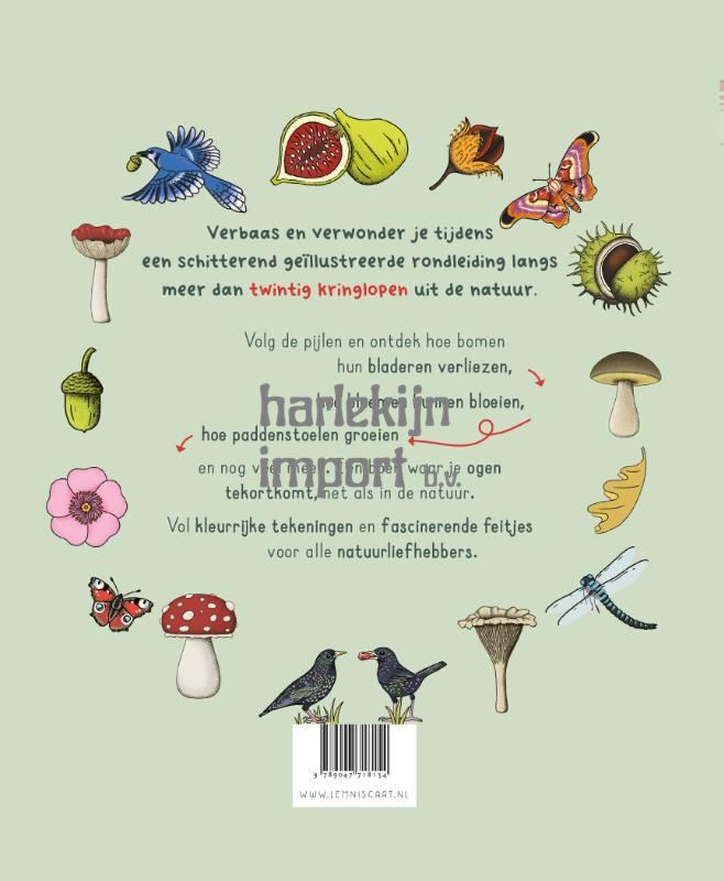 In Natuur. Zo zit het komen wetenschap en illustratie bij elkaar in een fascinerende visuele rondleiding langs meer dan twintig natuurkringlopen. Ontdek hoe bomen hun bladeren verliezen, waardoor bloemen bloeien, hoe en waarom zaden zich verspreiden en nog veel meer wonderen van de natuur.Het boek bestaat uit zes delen: bomen, bladeren, bloemen, zaden, paddenstoelen en seizoenen. In ieder deel wordt op een eenvoudige manier uitgelegd hoe verschillende kringlopen plaatsvinden, van bestuiving tot fotosynthese en van kieming tot afbraak. Nog nooit werden schijnbaar ingewikkelde processen zo eenvoudig uitgelegd. Je blijft je verbazen bij dit boek.