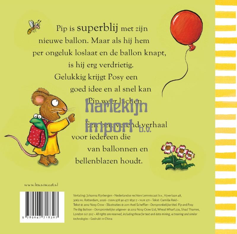 Pip en posy zijn peuters die het leven leren kennen. In hun serie verhalen komen alle aspecten – de leuke en de lastige – op een vrolijke manier aan bod. En het loopt altijd goed af. In De grote ballon is Pip heel trots op zijn mooie, nieuwe ballon. En als hij die per ongeluk laat ontsnappen en die knapt, is hij ontroostbaar. Maar Posy weet hem weer op te vrolijken met een leuke oplossing. De boeken van Pip en Posy zijn ideaal voor alle peuters en hun ouders! Er zullen nog meer boeken in de serie (her)uitgegeven worden.