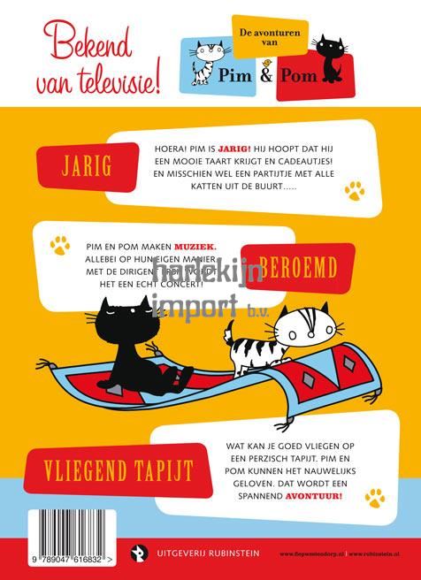 Deze stripverhalen zijn gemaakt naar afleveringen uit de animatieserie 'De avonturen van Pim & Pom', gebaseerd op de karakters van Mies Bouhuys en de tekeningen van Fiep Westendorp. Jarig - Hoera, Pim is jarig. Hij hoopt dat hij een mooie taart krijgt en cadeautjes. En misschien zelfs wel een partijtje met alle katten uit de buurt… Beroemd - Pim en Pom maken muziek. Allebei op hun eigen manier. Met de dirigent erbij wordt het een echt concert. Vliegend tapijt - Wat kan je goed vliegen met een Perzisch tapijt. Pim en Pom kunnen het nauwelijks geloven. Dat wordt een spannend avontuur.