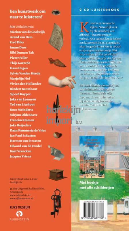 Kunst is er om naar te kijken. Natuurlijk is er bij elk schilderij een officieel kunsthistorisch verhaal. Zo’n verhaal kan je helpen een kunstwerk beter te begrijpen. Maar in goede kunst kun je vooral ook je eigen fantasie kwijt. Wat zie je zelf als je echt goed kijkt? De beste kinderboekenschrijvers van deze tijd schreven hun verhaal bij 25 beroemde meesterwerken uit het Rijksmuseum. Op deze cd dragen 5 geweldige acteurs en actrices de verhalen voor, tijdens livesessies in de OBA te Amsterdam.