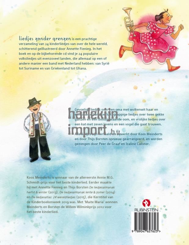 Liedjes zonder grenzen is een prachtige verzameling van 24 kinderliedjes van over de hele wereld, schitterend geïllustreerd door Annette Fienieg. Koos Meinderts vertaalde en bewerkte opnieuw 24 populaire kinderliedjes uit evenzoveel landen: volksliedjes van Syrië tot Spanje en van Griekenland tot Ghana. Gevoelige liedjes over een oma met wolkenwit haar en een paarse bamboefluit,