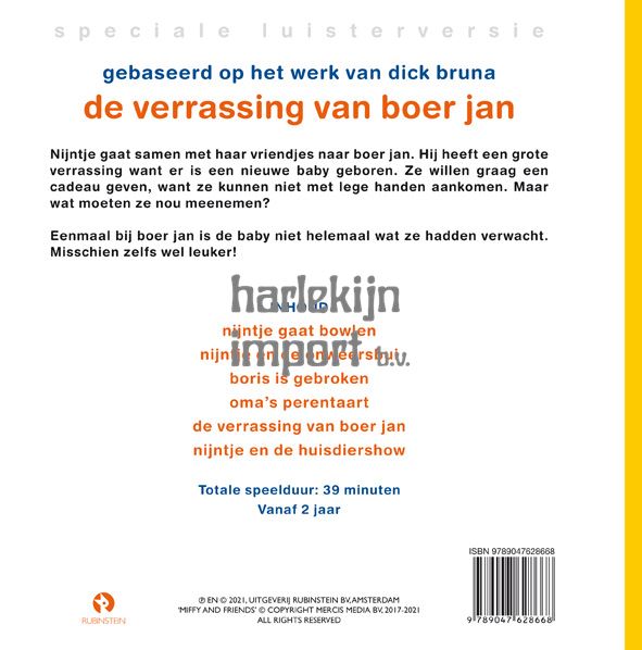 Een gloednieuw boek met cd over nijntje. Dit keer gaat nijntje samen met haar vriendjes naar boer Jan. Hij heeft een grote verrassing want er is een nieuwe baby geboren. Ze willen graag een verrassing meenemen, want ze kunnen niet met lege handen aankomen. Maar wat moeten ze nou meenemen? Als ze eenmaal zijn aangekomen is de baby toch niet helemaal wat ze hadden verwacht. Misschien zelfs wel leuker!