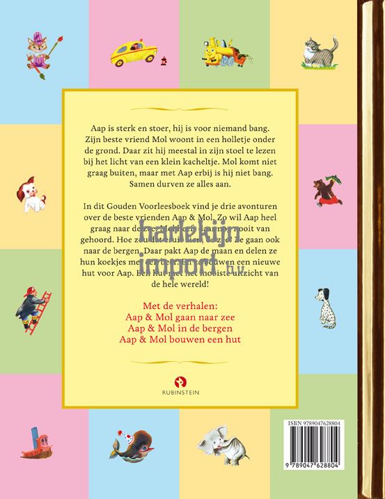 Aap is avontuurlijk en nieuwsgierig, Mol blijft liever binnen met een boek op schoot. Toch zijn ze de beste vrienden en gaan ze graag samen op pad. Ze gaan op zoek naar de zee, bouwen een hut, en ze delen hun koekjes met een beer. De geliefde klassiekers Aap en Mol gaan naar zee, Aap en Mol in de bergen en Aap en Mol bouwen een hut eindelijk weer verkrijgbaar, nu als Gouden Voorleesboek.