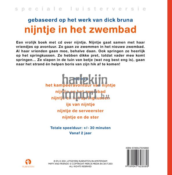 Een gloednieuw boek met cd over Nijntje. Nijntje gaat samen met haar vriendjes op avontuur. Ze gaan zwemmen in het nieuwe zwembad. Al haar vrienden gaan mee, behalve Daan. Nijntje en haar vriendjes springen erop los op een springkussen. Ze hebben dikke pret, tot vader mee komt springen… Ze slapen in de tuin van Betje (wat nog best eng is), gaan naar het strand én helpen boris van zijn hik af te komen!