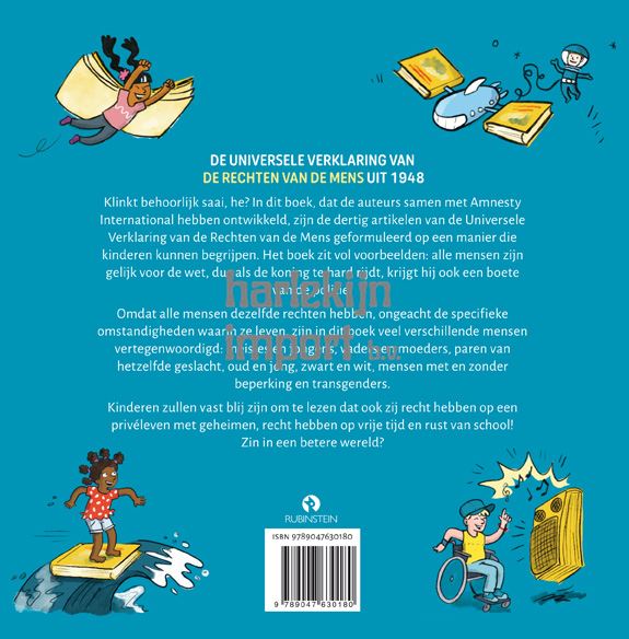 In dit boek, dat de auteurs samen met Amnesty International hebben ontwikkeld, zijn de dertig artikelen van de Universele Verklaring van de Rechten van de Mens geformuleerd op een manier die kinderen kunnen begrijpen. Het boek is doorspekt met vele voorbeelden: alle mensen zijn gelijk voor de wet, dus dat geldt ook voor een koning die door de politie wordt aangehouden als hij te hard rijdt. Omdat alle mensen dezelfde rechten hebben, ongeacht de specifieke omstandigheden waarin ze leven, zijn in dit boek veel verschillende mensen vertegenwoordigd: meisjes en jongens, vaders en moeders, paren van hetzelfde geslacht, oud en jong, zwart en wit, mensen met en zonder beperking, transgenders… En kinderen zullen zeker blij zijn te lezen dat ook zij recht hebben op een privéleven met geheimen of recht op vrije tijd en rust van school!