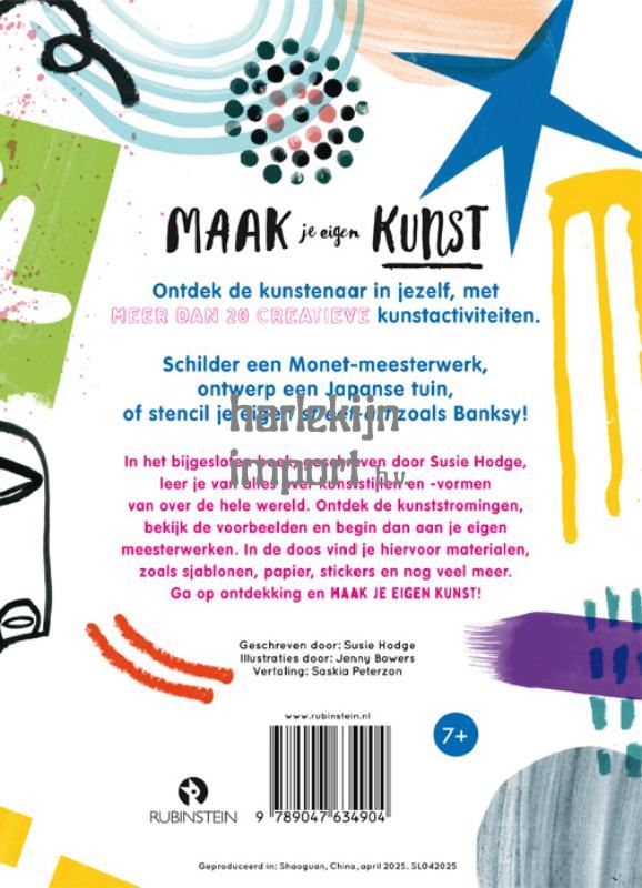 Ontdek de kunstenaar in jezelf, met meer dan 20 creatieve kunstactiviteiten. Schilder een Monet meesterwerk, ontwerp een Japanse tuin, of stencil je eigen street-art zoals Banksy! In het bijgesloten boek, geschreven door Susie Hodge, leer je van alles over kunststijlen en -vormen van over de hele wereld. Ontdek de kunststromingen, bekijk de voorbeelden en begin dan aan je eigen meesterwerken. In de doos vind je hiervoor materialen, zoals sjablonen, papier, stickers en nog veel meer. Ga op ontdekking en maak je eigen kunst!