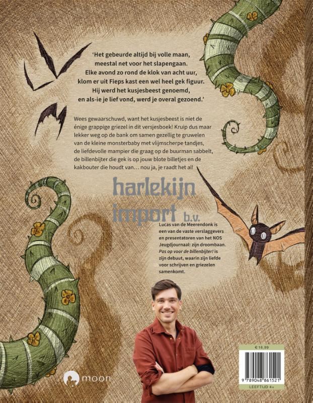Wees gewaarschuwd, want het kusjesbeest is niet de énige grappige griezel in dit versjesboek! Kruip dus maar lekker weg op de bank om samen gezellig te gruwelen van de kleine monsterbaby met vlijmscherpe tandjes, de liefdevolle mampier die graag op de buurman sabbelt, de billenbijter die gek is op jouw blote billetjes en de kakbouter die gek is op... nou ja, je raadt het al!