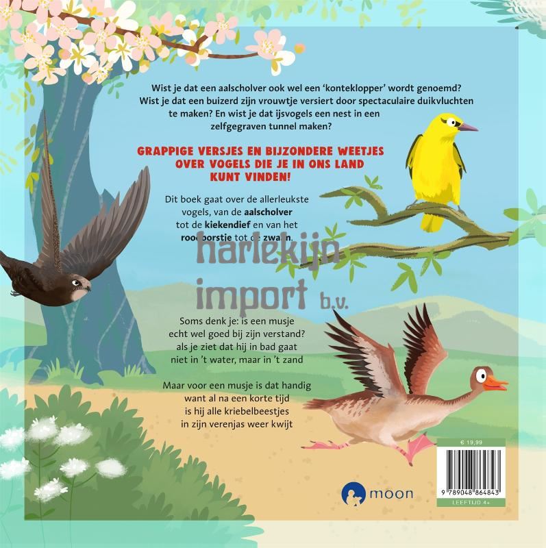 Een grappig en leerzaam boek met daarin heel veel versjes en weetjes over vogels die je in Nederland en Belgiƫ kunt vinden. Zowel kinderen als volwassenen zullen zich verwonderen over alle bijzondere dingen die zich in de natuur afspelen. Want wie wist er bijvoorbeeld dat een aalscholver ook wel een 'konteklopper' wordt genoemd? Of dat een buizerd zijn vrouwtje versiert door spectaculaire duikvluchten te maken? En wist je dat ijsvogels een nest in een zelfgegraven tunnel maken?