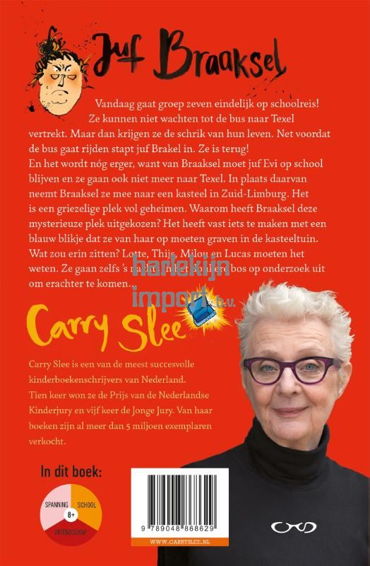 Eindelijk is het zover: vandaag gaat groep zeven op schoolreis! Ze kunnen niet wachten tot de bus naar Texel vertrekt. Maar dan krijgen ze de schrik van hun leven. Net voordat de bus gaat rijden stapt juf Brakel in. Ze dachten dat ze voorgoed van haar af waren, maar ze is terug! En het wordt nóg erger, want van Braaksel moet juf Evi op school blijven en ze gaan ook niet meer naar Texel. In plaats daarvan neemt Braaksel ze mee naar een kasteel in Zuid-Limburg. Het is een griezelige plek vol geheimen. Waarom heeft Braaksel deze mysterieuze plek uitgekozen? Het heeft vast iets te maken met een blauw blikje dat ze van haar op moeten graven in de kasteeltuin. Wat zou erin zitten? Lotte, Thijs, Milou en Lucas moeten het weten. Ze gaan zelfs 's nachts in het donkere bos op onderzoek uit om erachter te komen...