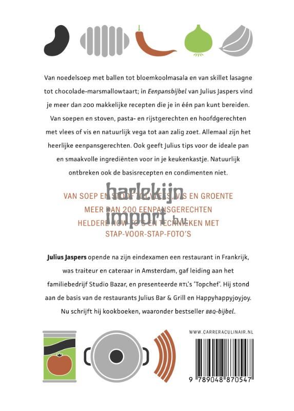 Een eenpansgerecht, de naam zegt het al, is een gerecht dat volledig uit één pan komt, dus geen garnituren kent, hooguit een smaakmaker ernaast (olie-saus-crunch). In eenpansbijbel ligt de nadruk op gemak, niet zo zeer op snelheid. Ondanks een pan zit in de meeste recepten de schijf van vijf. Weinig werk en vooral gezond!