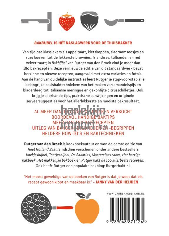 Met meer dan 130.000 verkochte exemplaren is Bakbijbel dé klassieker onder de kookboeken. Al 8 jaar lang hét standaardwerk over bakken. In deze geheel herziene editie staan nieuwe recepten, alles is aangepast naar deze tijd en ook de vormgeving is helemaal nieuw! Aan de hand van heldere instructies en duidelijke foto's leert Rutger van den Broek je stap voor stap alle belangrijke basisbaktechnieken: van amandelspijs en bladerdeeg tot Italiaanse meringue en citrusschilletjes konfijten. Daarnaast biedt Bakbijbel meer dan 160 bakrecepten: van tijdloze klassiekers als appeltaart, kletskoppen, slagroomsoesjes en wentelteefjes tot originele brownies, friandises, tulband en pistachepavlova á la Rutger. Ook geeft Rutger allerhande tips, praktische aanwijzingen en originele serveersuggesties voor het allerlekkerste en mooiste bakresultaat.