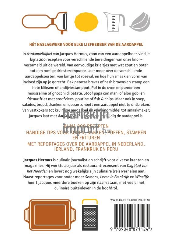 In Aardappelbijbel van Jacques Hermus, zoon van een aardappelboer, vind je meer dan 200 recepten voor verschillende bereidingen van onze knol - verzameld uit de wereld. Van eenvoudige krieltjes met wat zout en boter tot een romige driesterrenpuree. Leer meer over de verschillende aardappelsoorten, van bintje tot Bonnotte, en hoe hun smaak en vorm van invloed zijn op je gerecht. Bak patatas bravas of hash browns en stamp een hete bliksem of Leidse hutspot. Pof in de oven of boven open vuur en pureer een mousseline of gnocchi di patate.