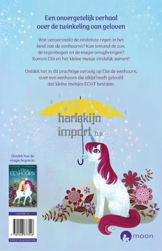 Er is iets ergs aan de hand in Eenhoornland: het blijft maar regenen! En dat is een groot probleem, want eenhoorns krijgen hun kracht en magie van de gouden zon, van prachtige regenbogen en van de glinstering van geloven. Gelukkig heeft Elin de eenhoorn nog al haar kracht en magie omdat ze altijd is blijven geloven dat kleine meisjes écht bestaan! En gelukkig is er één klein meisje dat voelt dat ze hard nodig is in Eenhoornland. Kunnen Elin en het kleine meisje misschien samen de eenhoorns redden? *Met glitter op de cover!*