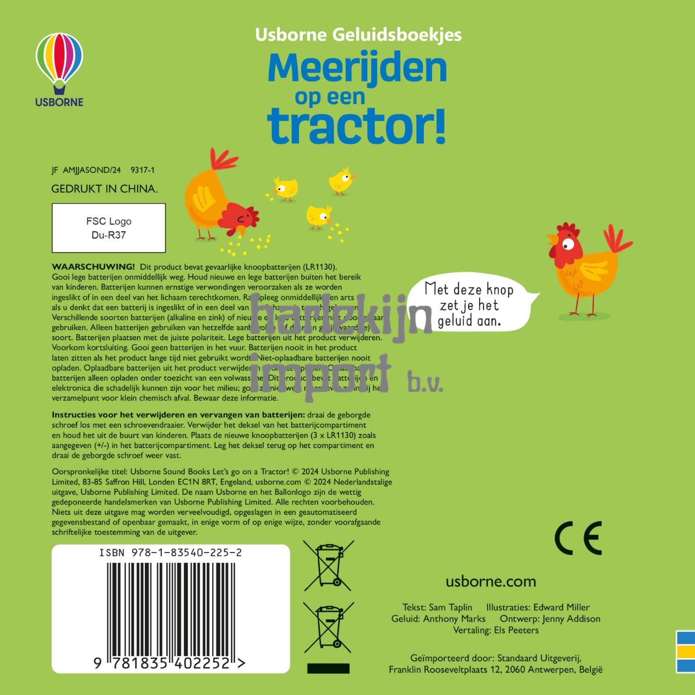 Druk op de knoppen en je hoort de tractor- en boerderijgeluiden. Van het opstarten van de motor tot de combine die aan het oogsten is komt de wereld van de boerderij tot leven… en misschien dat er ook een paar dieren zijn! Een grappig, perfect boekje voor kinderen dat laat zien wat een tractor allemaal kan doen op de boerderij.