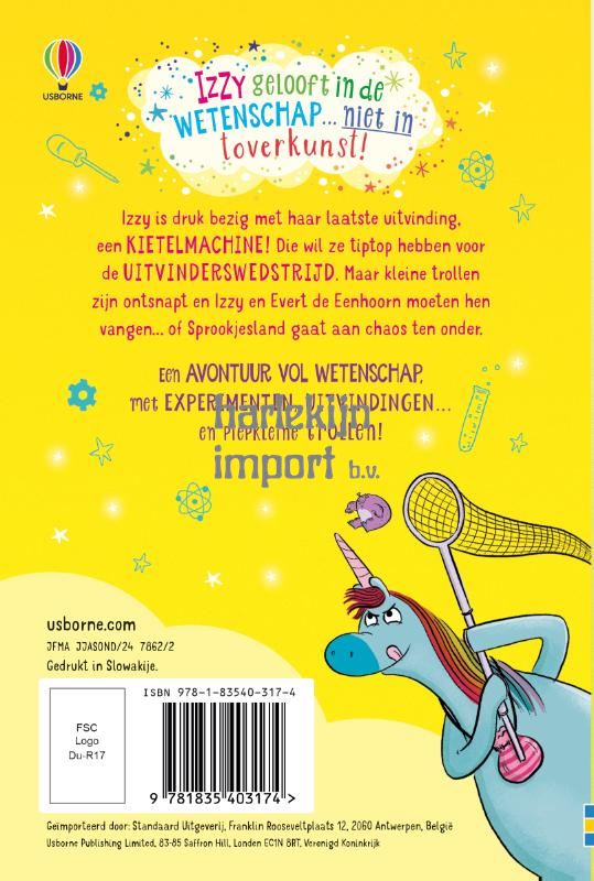 Izzy de uitvinder maakt jonge lezers aan het lachen in deze serie over wetenschap, magie en een sympathieke eenhoorn. Vol illustraties en eenvoudige tekst en daardoor perfect voor beginnende lezers. Izzy sleutelt aan haar kietelmachine voor de uitvinderswedstrijd als ze erachter komt dat er piepkleine trollen in het park bij haar in de buurt wonen – en dat is helemaal HAAR schuld (ze had ze PER ONGELUK meegenomen uit Sprookjesland). Nu heerst er paniek en chaos in Sprookjesland: de wolven achtervolgen de tovenaars en boze kabouters pesten de arme elfjes. Izzy moet de trollen vinden en terugbrengen naar Sprookjesland en roept de hulp in van haar trouwe vriend Evert de eenhoorn. Lukt het Izzy en Evert om de trollen te vangen? En is ze op tijd terug voor haar UITVINDERSWEDSTRIJD?