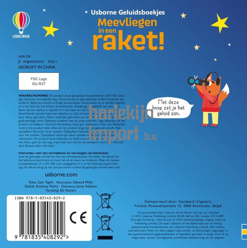 3...2...1...Start! Dit boek brengt de spannende reis van een astronaut tot leven, zoals de lancering van een raket of een meteorietenstorm. Met vijf meeslepende geluiden en schattige dierenillustraties is dit de perfecte manier om jonge kinderen kennis te laten maken met de fascinerende wereld van ruimtereizen.
