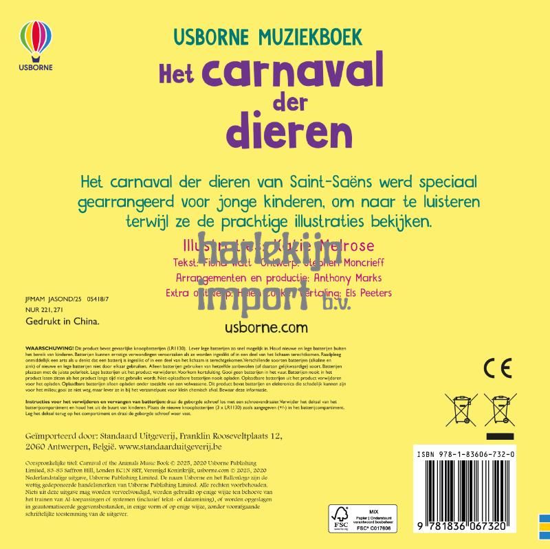 Het carnaval der dieren van componist Saint-Saëns is speciaal voor dit boek gearrangeerd voor jonge kinderen. Ze horen de muziek terwijl ze de illustraties bekijken: leeuwen trekken over de Afrikaanse vlakte, olifanten banjeren door het oerwoud, zwanen glijden moeiteloos door een riviertje en nog meer. Een fijne kennismaking met de populaire muziek van Saint-Saëns.