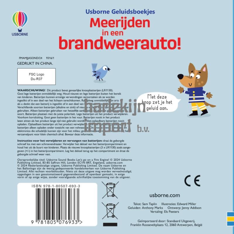 Ga op stap met een groepje brandweerhonden terwijl ze zich voorbereiden op hun heldendaden en kom erachter wat de brandweer allemaal doet. Met geluiden van onder meer de sirene en het brandalarm dat afgaat in de kazerne. Spannende nieuwe serie geluidsboekjes met kleurige, grappige illustraties en vijf geluiden.