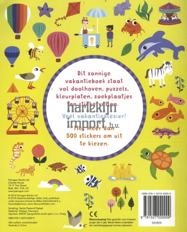 Dit zonnige vakantieboek staat vol doolhoven, puzzels, kleurplaten, zoekplaatjes en stickervellen.