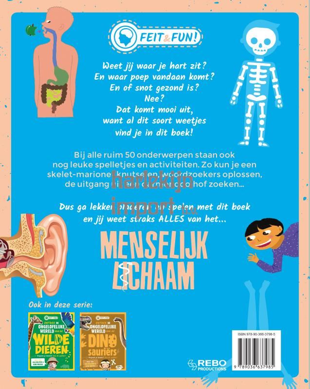Weet jij waar je hart zit? En waar poep vandaan komt? En of snot gezond is? Nee? Dat komt mooi uit, want al dit soort weetjes vind je in dit boek! Bij alle ruim 50 onderwerpen staan ook nog leuke spelletjes en activiteiten. Zo kun je een skelet-marionet knutselen, woordzoekers oplossen, de uitgang uit een darmendoolhof zoeken... Dus ga lekker bladeren en spelen met dit boek en jij weet straks ALLES van het... MENSELIJK LICHAAM