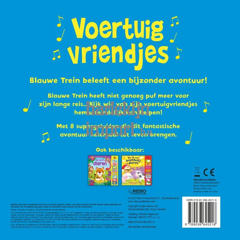 Blauwe Trein beleeft een bijzonder avontuur! Blauwe Trein heeft niet genoeg puf meer voor zijn lange reis… Kijk wie van zijn voertuigvriendjes hem uiteindelijk kan helpen! Met 8 supergeluiden die dit fantastische avontuur helemaal tot leven brengen.