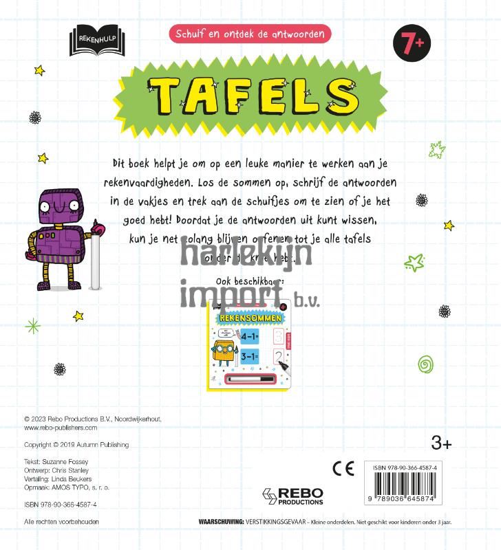 Dit boek helpt je om op een leuke manier te werken aan je rekenvaardigheden. Los de sommen op, schrijf de antwoorden in de vakjes en trek aan de schuifjes om te zien of je het goed hebt! Doordat je de antwoorden uit kunt wissen, kun je net zolang blijven oefenen tot je alle tafels onder de knie hebt.