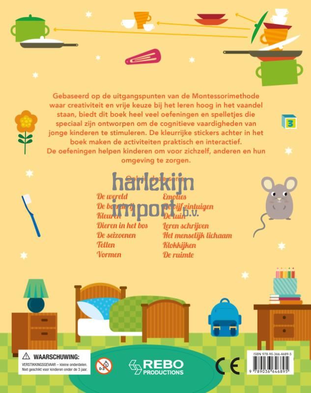 Gebaseerd op de uitgangspunten van de Montessorimethode waar creativiteit en vrije keuze bij het leren hoog in het vaandel staan, biedt dit boek heel veel oefeningen en spelletjes die speciaal zijn ontworpen om de cognitieve vaardigheden van jonge kinderen te stimuleren. De kleurrijke stickers achter in het boek maken de activiteiten praktisch en interactief. De oefeningen helpen kinderen om voor zichzelf, anderen en hun omgeving te zorgen.