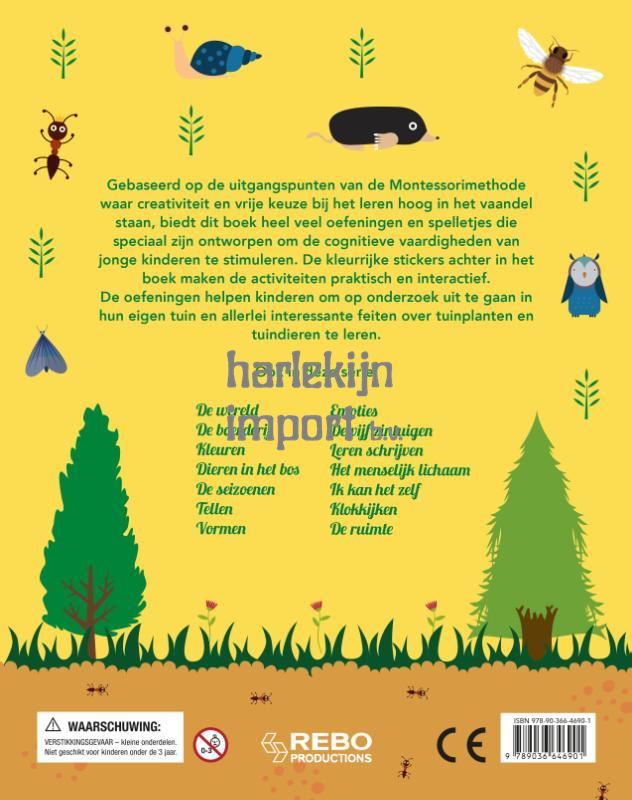 Gebaseerd op de uitganspunten van de Montessorimethode waar creativiteit en vrije keuze bij het leren hoog in het vaandel staan, biedt dit boek heel veel oefeningen en spelletjes die speciaal zijn ontworpen om de cognitieve vaardigheden van jonge kinderen te stimuleren. De kleurrijke stickers achter in het boek maken de activiteiten praktisch en interactief. De oefeningen helpen kinderen om op onderzoek uit te gaan in hun eigen tuin en allerlei interessante feiten over tuinplanten en tuindieren te leren.