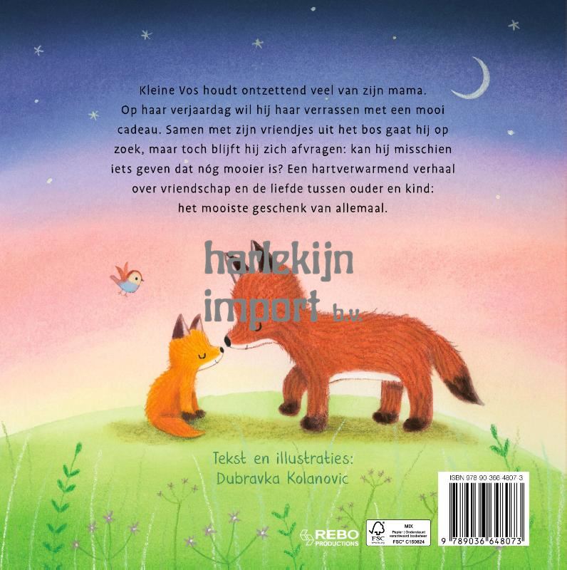 Kleine Vos houdt ontzettend veel van zijn mama. Op haar verjaardag wil hij haar verrassen met een mooi cadeau. Samen met zijn vriendjes uit het bos gaat hij op zoek, maar toch blijft hij zich afvragen: kan hij misschien iets geven dat nóg mooier is? Een hartverwarmend verhaal over vriendschap en de liefde tussen ouder en kind: het mooiste geschenk van allemaal.