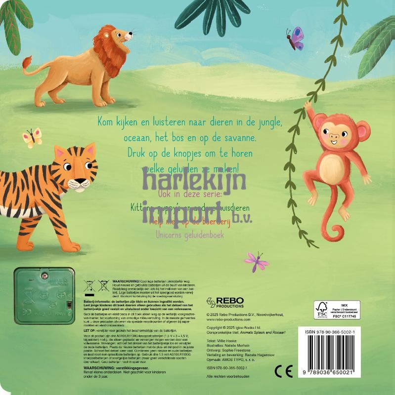 Kom kijken en luisteren naar dieren in de jungle, oceaan, het bos en op de savanne. Druk op de knopjes om te horen welke geluiden ze maken!