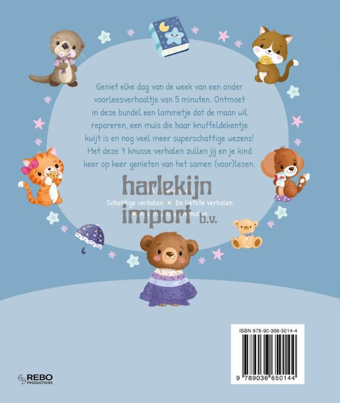 Geniet elke dag van de week van een ander voorleesverhaaltje van 5 minuten. Ontmoet in deze bundel een lammetje dat de maan wil repareren, een muis die haar knuffeldekentje kwijt is en nog veel meer superschattige wezens! Met deze 7 knusse verhalen zullen jij en je kind keer op keer genieten van het samen (voor)lezen.