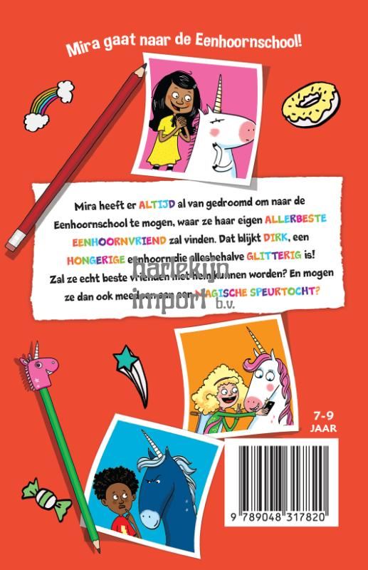Het is Mira's allergrootste wens om ooit naar de Eenhoornschool te gaan, waar ze haar allerbeste eenhoornvriend zal ontmoeten. Ze is dan ook door het dolle heen wanneer ze op een dag haar toelatingsbrief ontvangt. Wie zal haar eenhoorn worden: Angelica, Delilah Glinsterhoef, Ster? Helaas: Mira krijgt Dirk. Dirk is niet elegant, niet glitterig: Dirk is vooral heel erg lui. Zullen Mira en Dirk ooit vrienden worden, en op een magische speurtocht mogen gaan?