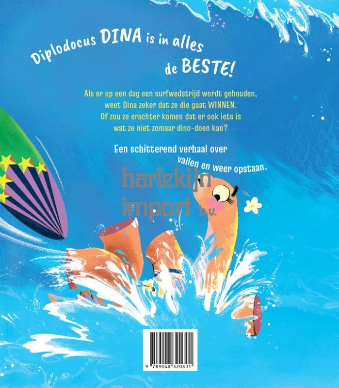 Diplodocus Dina is echt overal goed in! Er is eigenlijk niets wat ze niet kan. Dus wanneer er een surfwedstrijd in haar stad gehouden wordt, is ze ervan overtuigd dat ze zal WINNEN. Komt Dina erachter dat ze niet zomaar alles dino-doen kan? Zal ze radeloos zijn? Of zal ze ontdekken dat plezier hebben meer is dan alleen winnen? Een verhaal over veerkracht, moed en met beide benen op de grond leren staan.