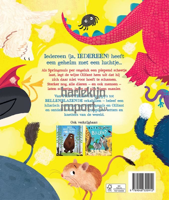 Iedereen (ja, IEDEREEN) heeft een geheim met een luchtje... Als Springmuis per ongeluk een piepend scheetje laat, legt de wijze Olifant hem uit dat hij zich daar niet voor hoeft te schamen. Sterker nog, alle dieren – en mensen! – laten scheetjes, ieder op zijn eigen manier. Van PRUTTELENDE puppy’s tot BELLENBLAZENDE orkabillen – beleef een hilarisch avontuur met Springmuis en Olifant en ontdek de leukste en grappigste tetters en knetters van de wereld.