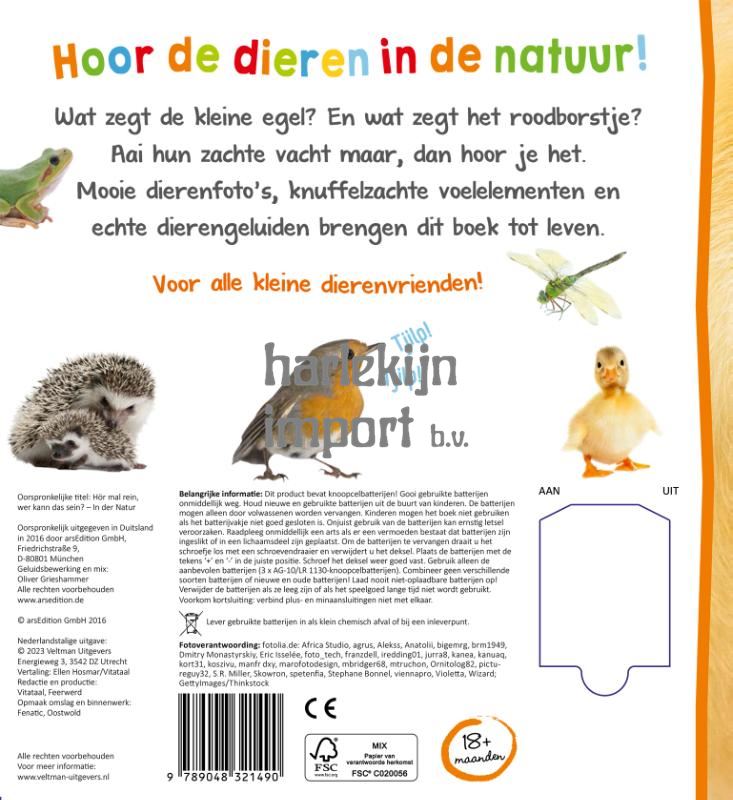 Hoor de dieren in de natuur! Wat zegt de kleine egel? En wat zegt het roodborstje? Aai hun zachte vacht maar, dan hoor het het. Mooie dierenfoto’s, knuffelzachte voelelementen en echte dierengeluiden brengen dit boek tot leven. Voor alle kleine dierenvrienden!