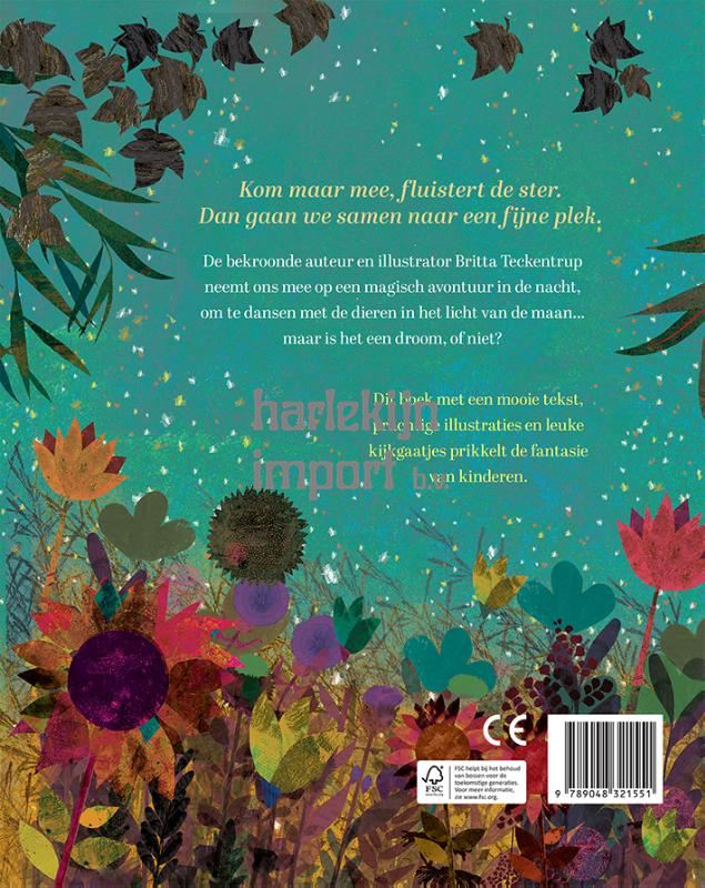 Kom maar mee, fluistert de ster. Dan gaan we samen naar een fijne plek. De bekroonde auteur en illustrator Britta Teckentrup neemt ons mee op een magisch avontuur in de nacht, om te dansen met de dieren in het licht van de maan... maar is het een droom, of niet? Dit boek met een mooie tekst, prachtige illustraties en leuke kijkgaatjes prikkelt de fantasie van kinderen.