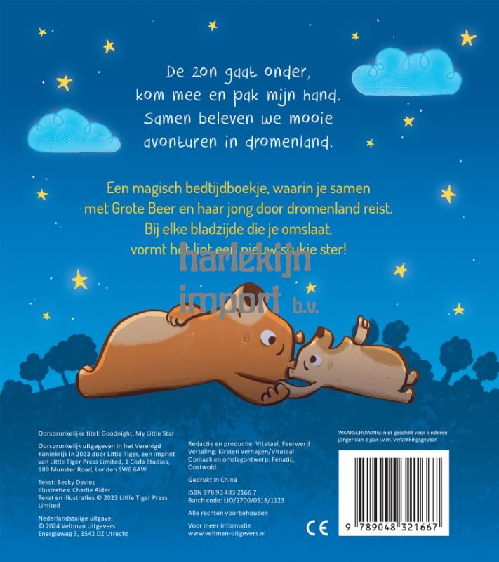 De zon gaat onder, kom mee en pak mijn hand. Samen beleven we mooie avonturen in dromenland. Een magisch bedtijdboekje, waarin je samen met Grote Beer en haar jong door dromenland reist. Bij elke bladzijde die je omslaat, vormt het lint een nieuw stukje ster!