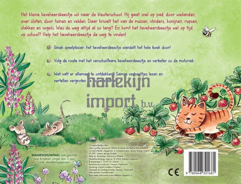 Het kleine lieveheersbeestje wil naar de kleuterschool. Hij gaat snel op pad: door weilanden, over sloten, door tuinen en velden. Daar krioelt het van de muizen, vlinders, konijnen, rupsen, slakken en vogels. Was de weg altijd al zo lang? En komt het lieveheersbeestje wel op tijd op school? Help het lieveheersbeestje de weg te vinden! [*] Uniek speelplezier: het lieveheersbeestje wandelt het hele boek door! [*] Volg de route met het verschuifbare lieveheersbeestje en verbeter zo de motoriek. [*] Wat valt er allemaal te ontdekken? Samen verhaaltjes lezen en vertellen vergroten de woordenschat.