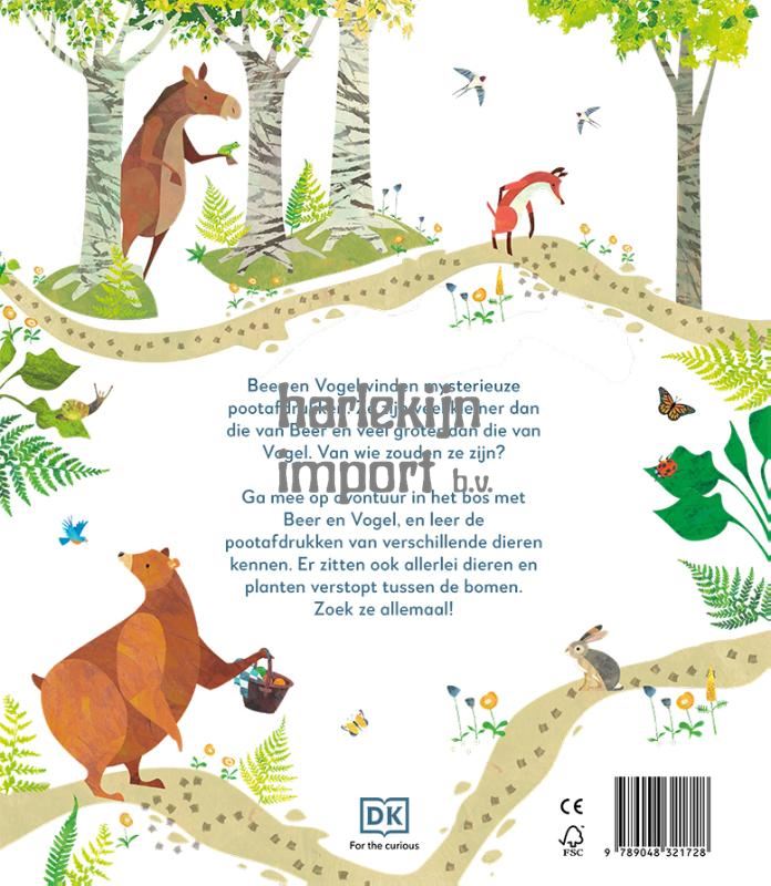 Beer en Vogel vinden mysterieuze pootafdrukken. Ze zijn veel kleiner dan die van Beer en veel groter dan die van Vogel. Van wie zouden ze zijn? Ga mee op avontuur in het bos met Beer en Vogel, en leer de pootafdrukken van verschillende dieren kennen. Er zitten ook allerlei dieren en planten verstopt tussen de bomen. Zoek ze allemaal!