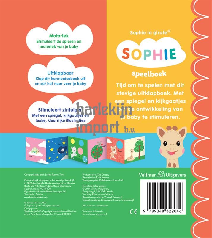 Sophie la girafeĀ® Sophie speelboek Tijd om te spelen met dit stevige uitklapboek. Met een spiegel en kijkgaatjes om de ontwikkeling van je baby te stimuleren. Motoriek Stimuleert de spieren en motoriek van je baby Uitklapbaar Klap dit harmonicaboek uit en zet het neer voor je baby Stimuleert zintuigen Met een spiegel, kijkgaatjes en leuke, kleurrijke illustraties