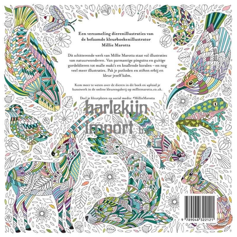 Een verzameling dierenillustraties van de befaamde kleurboekenillustrator Millie Marotta Dit schitterende werk van Millie Marotta staat vol illustraties van natuurwonderen. Van parmantige pinguïns en guitige gordeldieren tot malle maki’s en knallende koralen – en nog veel meer illustraties. Pak je potloden en stiften erbij en kleur jezelf kalm. Kom meer te weten over de dieren in dit boek en upload je kunstwerk in de online kleurengalerij op milliemarotta.co.uk. Deel je kleurplaten op social media #MillieMarotta