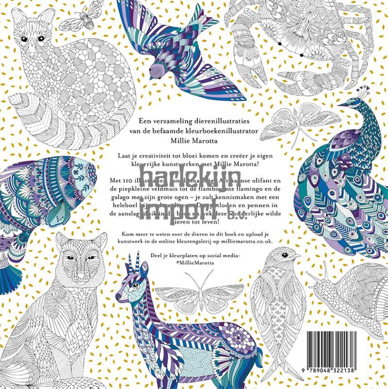 Een verzameling dierenillustraties van de befaamde kleurboekenillustrator Millie Marotta Laat je creativiteit tot bloei komen en creëer je eigen kleurrijke kunstwerken met Millie Marotta! Met 110 illustraties, van de machtige Afrikaanse olifant en de piepkleine veldmuis tot de flamboyante flamingo en de galago met zijn grote ogen – je zult kennismaken met een heleboel bijzondere dieren. Dus potloden en pennen in de aanslag, duik in dit boek en wek deze wonderlijke wilde dieren tot leven! Kom meer te weten over de dieren in dit boek en upload je kunstwerk in de online kleurengalerij op milliemarotta.co.uk.
