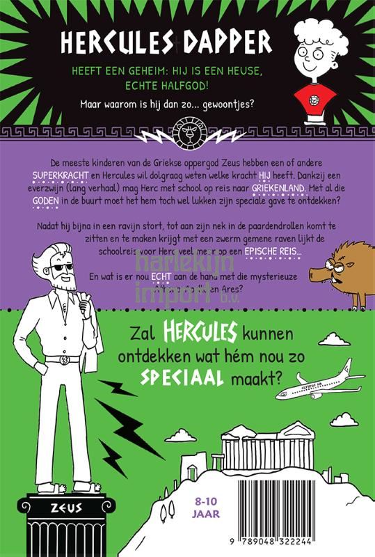 HERCULES DAPPER HEEFT EEN GEHEIM: HIJ IS EEN HEUSE, ECHTE HALFGOD! Maar waarom is hij dan zo... gewoontjes? De meeste kinderen van de Griekse oppergod Zeus hebben een of andere SUPERKRACHT en Hercules wil dolgraag weten welke kracht HIJ heeft. Dankzij een everzwijn (lang verhaal) mag Herc met school op reis naar GRIEKENLAND. Met al die GODEN in de buurt moet het hem toch wel lukken zijn speciale gave te ontdekken? Nadat hij bijna in een ravijn stort, tot aan zijn nek in de paardendrollen komt te zitten en te maken krijgt met een zwerm gemene raven lijkt de schoolreis voor Herc veel meer op een EPISCHE REIS… En wat is er nou ECHT aan de hand met die mysterieuze Athena, Apollo en Ares? Zal HERCULES kunnen ontdekken wat hém nou zo speciaal maakt?
