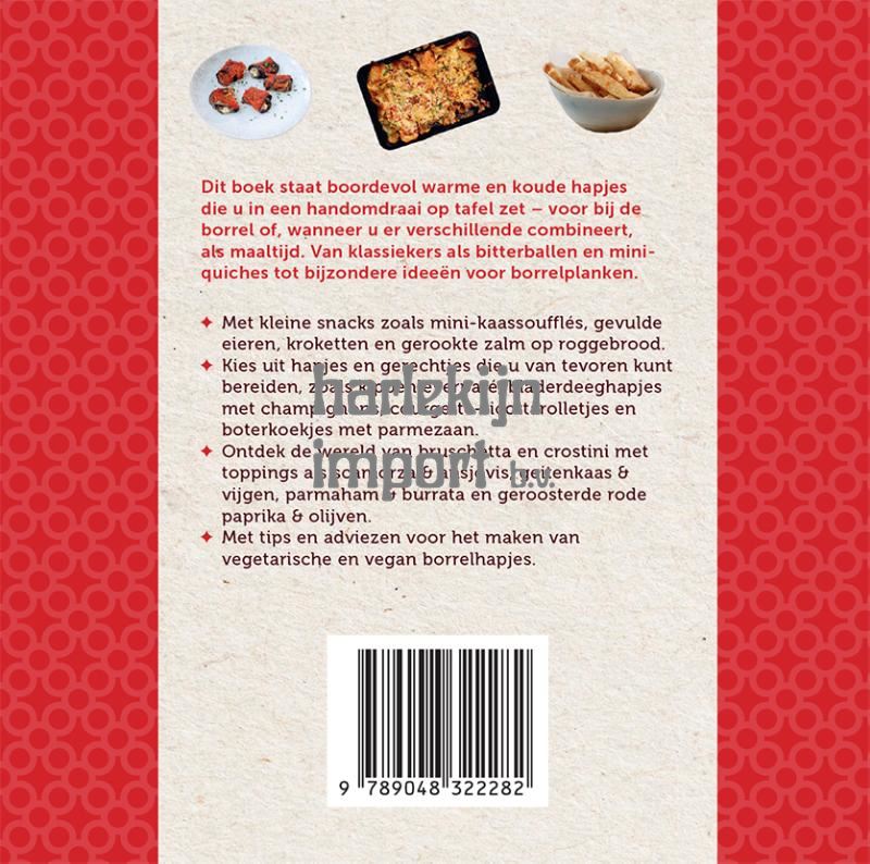 Dit boek staat boordevol warme en koude hapjes die u in een handomdraai op tafel zet – voor bij de borrel of, wanneer u er verschillende combineert, als maaltijd. Van klassiekers als bitterballen en mini-quiches tot bijzondere ideeën voor borrelplanken. - Met kleine snacks zoals mini-kaassoufflés, gevulde eieren, kroketten en gerookte zalm op roggebrood. - Kies uit hapjes en gerechtjes die u van tevoren kunt bereiden, zoals kippenleverpaté, bladerdeeghapjes met champignons, courgette-ricottarolletjes en boterkoekjes met parmezaan. - Ontdek de wereld van bruschetta en crostini met toppings als scarmoza & ansjovis, geitenkaas & vijgen, parmaham & burrata en geroosterde rode paprika & olijven. - Met tips en adviezen voor het maken van vegetarische en vegan borrelhapjes.