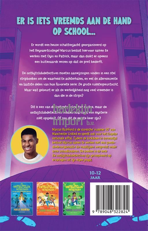 Er is iets vreemds aan de hand op school… Er wordt een heuse schattenjacht georganiseerd op het Reynaertcollege! Marcus besluit hiervoor samen te werken met Oyin en Patrick, maar dan duikt er opeens een buitenaards wezen op dat de pret bederft. De ontbijtclubdetectives moeten aanwijzingen vinden in een stel stripboeken om de waarheid te achterhalen, en wel de allernieuwste en laatste delen van hun favoriete serie: De grote ruimtespeurtocht. Maar wat gebeurt er als de werkelijkheid nog veel vreemder is dan die in de strips? Dit is een van de lastigste zaken tot nu toe, maar de ontbijtclubdetectives hebben nog nooit een mysterie níét opgelost. Of zou dit de eerste keer zijn?