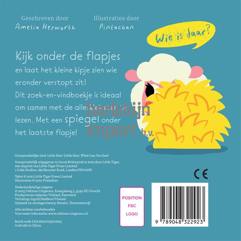 Kijk onder de flapjes en laat het kleine kipje zien wie eronder verstopt zit! Dit zoek-en-vindboekje is ideaal om samen met de allerkleinsten te lezen. Met een spiegel onder het laatste flapje!