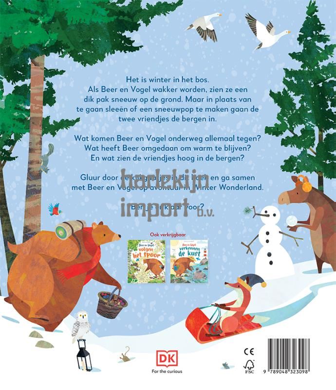 Het is winter in het bos. Als Beer en Vogel wakker worden, zien ze een dik pak sneeuw op de grond. Maar in plaats van te gaan sleeën of een sneeuwpop te maken gaan de twee vriendjes de bergen in. Wat komen Beer en Vogel onderweg allemaal tegen? Wat heeft Beer omgedaan om warm te blijven? En wat zien de vriendjes hoog in de bergen? Gluur door de kijkgaatjes in dit boek en ga samen met Beer en Vogel op avontuur in Winter Wonderland. Ben je er klaar voor?